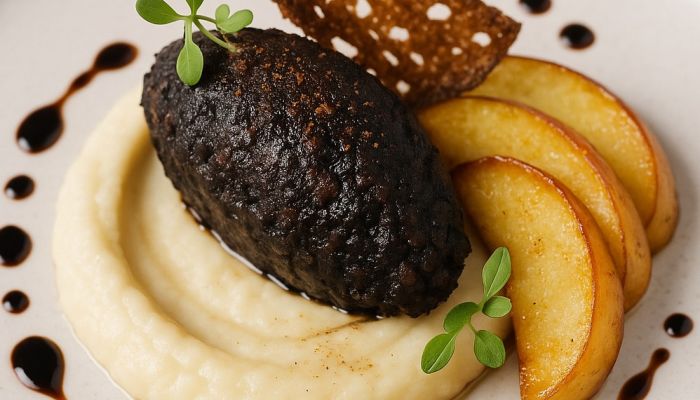 Morcilla con manzana asada, puré de apionabo y crujiente de pan de centeno”